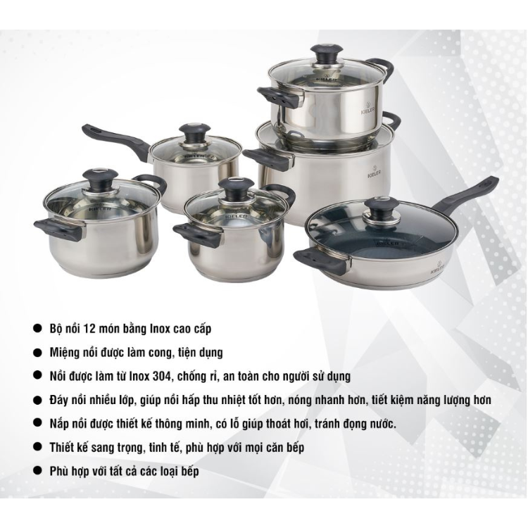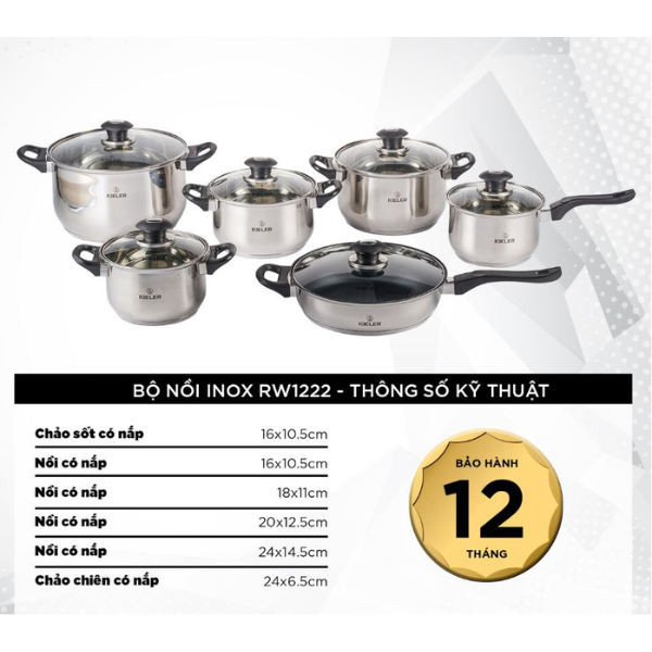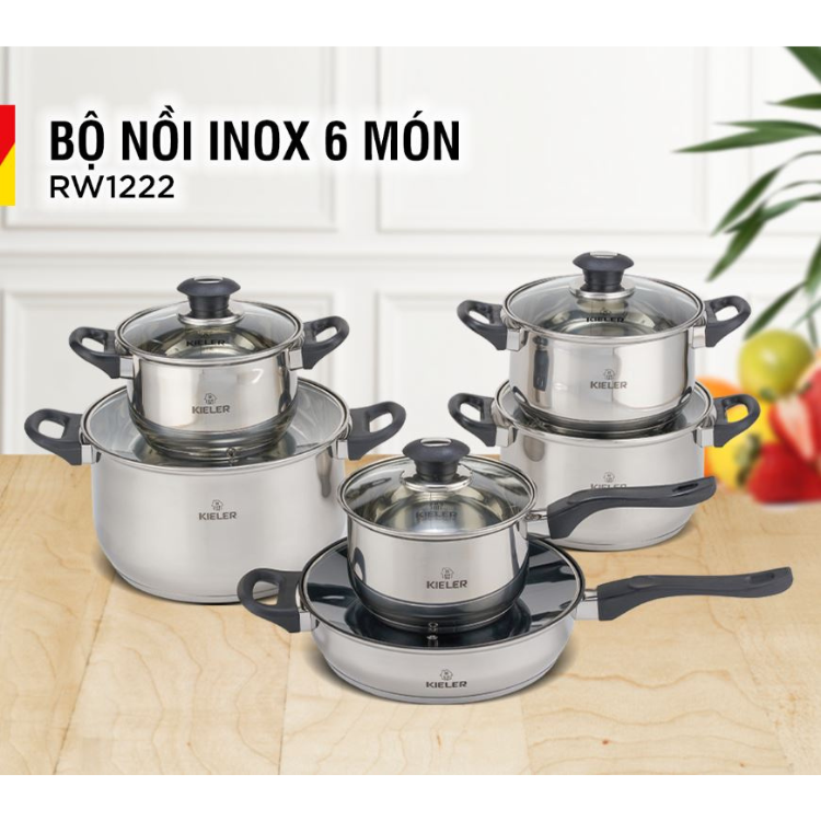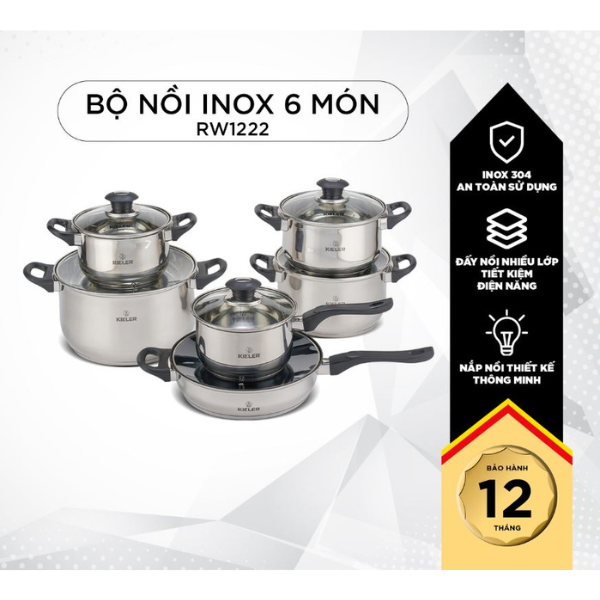 - Tên sản phẩm: Bộ nồi chảo inox 6 món cao cấp Kieler RW1222 nấu nhanh, tiết kiệm điện (Gồm 4 nồi và 2 chảo)