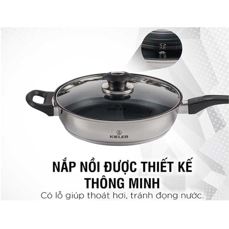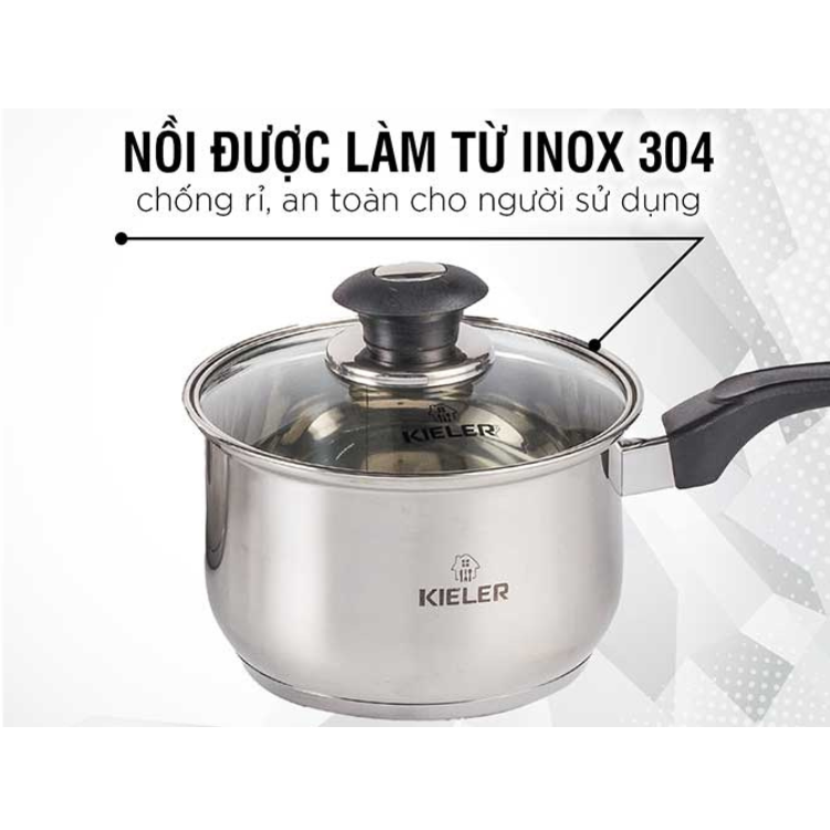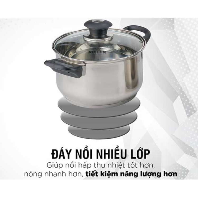 Kieler đã lựa chọn chất liệu Inox 304 cao cấp dày 0.5mm, có tính chống ăn mòn cao, không tác dụng với thức ăn, miễn nhiễm giải phóng các chất có hại cho sức khỏe người dùng. Ở giữa là lớp nhôm nguyên chất dày 1.3mm có khả năng truyền nhiệt và tản nhiệt nhanh, cho phép nhiệt tỏa đều đáy xoong, hạn chế tình trạng cháy khét thực phẩm.