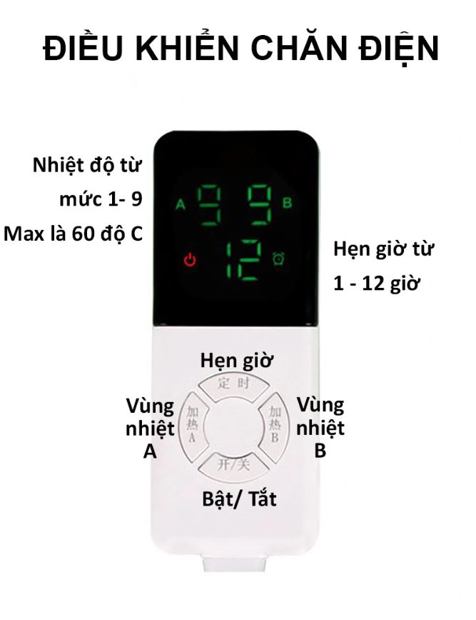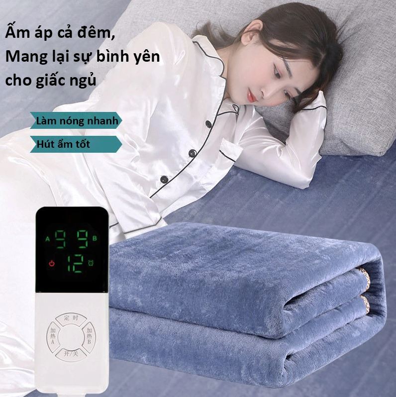 - Điều khiển 4 mức nhiệt độ. Bề mặt có một lớp lông mềm mại đặc biệt bao phủ giúp cho thoáng khí. Điều khiển 2 vùng độc lập, có chế độ hẹn giờ