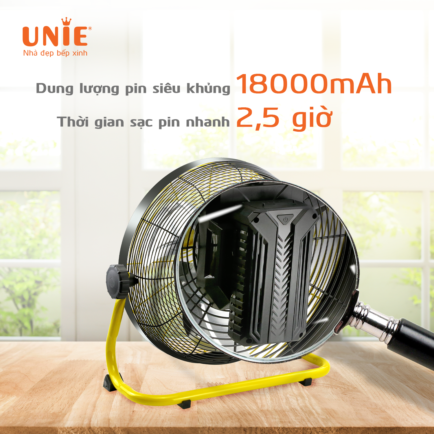 UE-880 sử dụng Pin sạc Lithium có độ bền và tuổi thọ dài, có thể tháo rời thuật tiện cho việc sạc thiết bị ở bất kì đâu. Thời gian sạc pin chỉ 2,5h. Dung lượng pin siêu khủng: 18000mAh. Bạn có thể sử dụng trong trường hợp mất điện dài: hoạt động liên tục từ 3,5h đến 20h tuỳ vào tốc độ gió mà bạn chọn.